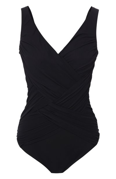 Несмотря на лаконичный черный цвет слитный купальник с широкими бретелями не выглядит просто. Все дело в сложной драпировке на передней полочке, акцентирующей внимание на тонкой талии и добавляющей силуэту скульптурность. Модель с V-образным неглубоким вырезом и открытой спиной выполнена из плотной быстросохнущей микрофибры: прочный материал хорошо тянется и принимает первоначальную форму.