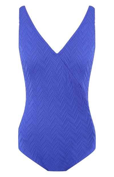 Слитный купальник яркого синего цвета выполнен из тонкой фактурной микрофибры с жаккардовым шевронным узором. Изделие из такого материала быстро сохнет и не деформируется со временем. Лаконичная модель с неглубоким вырезом и открытой спиной прошита зигзагообразной строчкой, поэтому швы хорошо тянутся, не врезаясь в кожу и не пережимая сосуды.