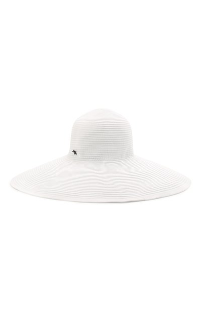 Широкополая шляпа белого цвета органично впишется в пейзаж из белоснежного песка и морских волн. Модель сложили из узких текстильных лент по кругу, искусно так создав имитацию плетения из соломки. У основания тульи закрепили небольшую фирменную деталь в виде морской звезды.