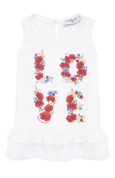 Белоснежный топ стилизовали под базовую майку. Ассоциации вызывают и крой, и нежный хлопковый трикотаж. Праздничное настроение задали с помощью воланов снизу и красочного цветочного мотива, из которого сложили на передней полочке надпись «Love». Круглую горловину и проймы подчеркнули вывязанным крючком волнистым кантом.