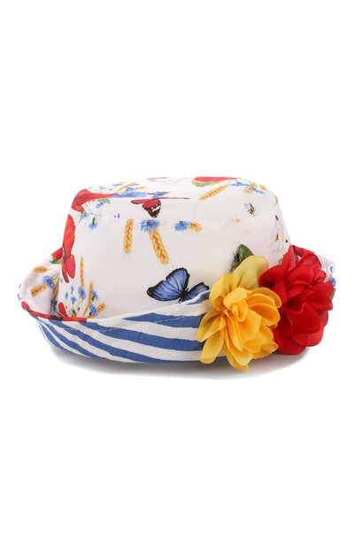 Для изготовления белой панамы с ярким изображением красных маков мастера марки использовали тонкий хлопковый поплин. Легкий материал хорошо пропускает воздух и защищает голову от прямых солнечных лучей, поэтому в такой вещи будет комфортно в зной. Широкие поля с голубым полосатым узором украшены крупными объемными аппликациями в виде пионов.