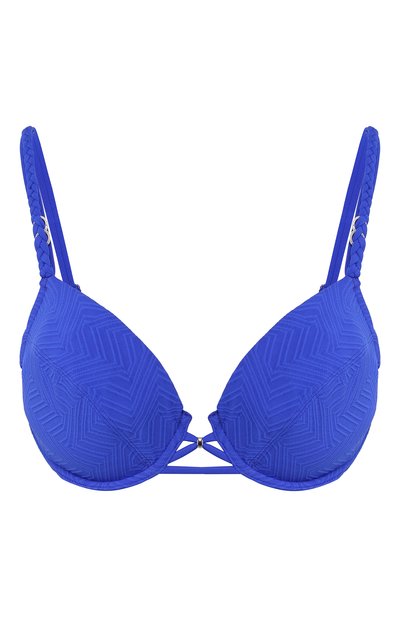 Для создания ярко-синего бра с плотными чашечками мастера марки использовали прочный быстросохнущий текстиль с фактурным геометрическим микроузором. За комфортную посадку изделия по фигуре отвечают регулируемые бретели. Изделие декорировано плетеной тесьмой с небольшими серебристыми кольцами.