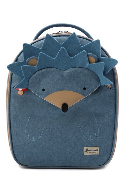 По форме и за счет короткой ручки голубой чемодан на двух колесах напоминает рюкзак. Аксессуар из плотного фактурного текстиля украсили аппликациями, вставками и вышивкой, которые вместе складываются в игрушечного ежика. В основном отделении предусмотрели сетчатый отсек и эластичные ленты. На передней панели разместили патч с логотипом бренда.