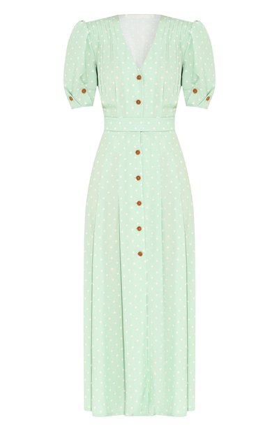 Ульяне Сергеенко нравится создавать платья в ретро-стиле, и светло-зеленая приталенная модель из весенне-летней коллекции — как раз из их числа. О вдохновении здесь напоминает и длина до середины икр, и пышные короткие рукава, и белый горох на тонком хлопке. Лиф с V-образным вырезом дополнен плоскими складками, которые сочетаются с вытачками, отвечающими за посадку и форму подола.