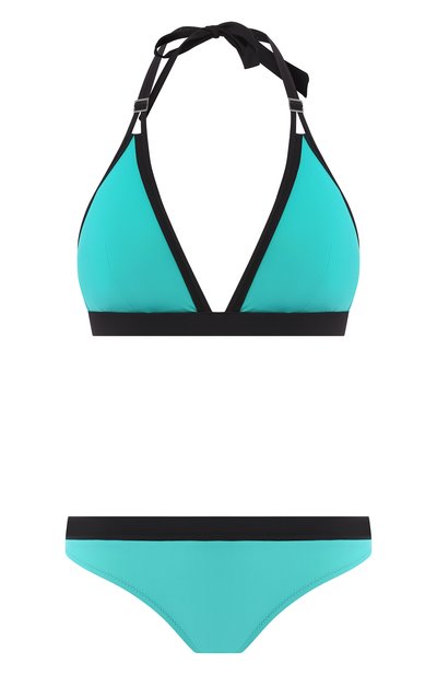 Бирюзовый раздельный купальник изготовлен мастерами бренда из стрейчевой микрофибры, которая быстро сохнет и не теряет форму со временем. Посадка бра с мягкими треугольными чашечками регулируется завязками на шее. Эластичный пояс плавок-бикини плотно облегает тело, не оставляя следов на коже.