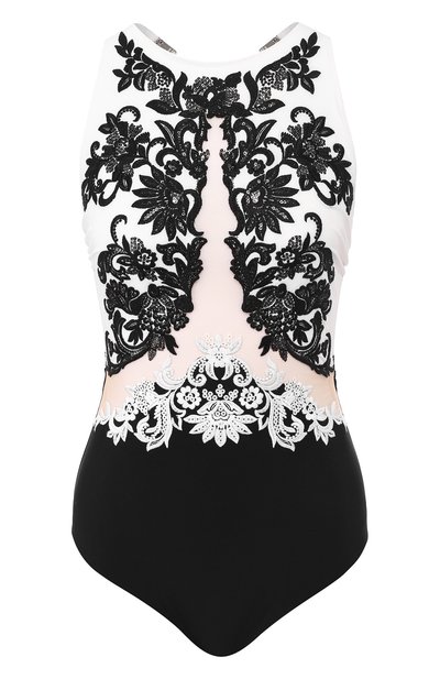 Такой купальник подойдет для вечеринки у бассейна: несмотря на классическое сочетание черного и белого, он не выглядит просто за счет контрастной цветочной вышивки, подчеркнутой пайетками. Эффект поддерживает прозрачная тюлевая вставка спереди. Слитная модель из плотного эластичного материала фиксируется парой широких перекрестных лямок на спинке.