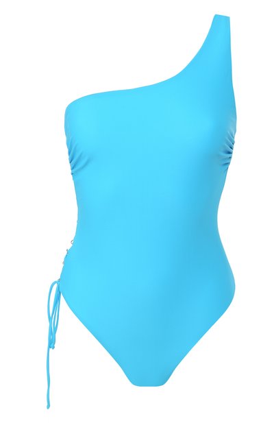 Слитный купальник ярко-голубого цвета привлекает внимание не только открытым плечом: на левом боку есть шнуровка с крупными металлическими люверсами. Это не только декоративный, но и функциональный элемент, позволяющий отрегулировать посадку. Для производства модели мастера марки использовали тонкий эластичный материал, который не поблекнет со временем.