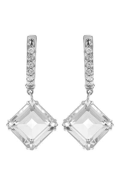 Небольшие серьги добавят образу блестящий акцент. Модель выполнили из полированного серебра 925-й пробы, покрытого слоем прочного родия. Холодное сияние металла усиливает дорожка из сверкающих кристаллов и ромбовидная подвеска с прозрачным горным хрусталем в ступенчатой огранке, красиво мерцающая в лучах света.