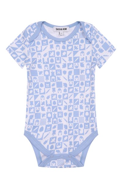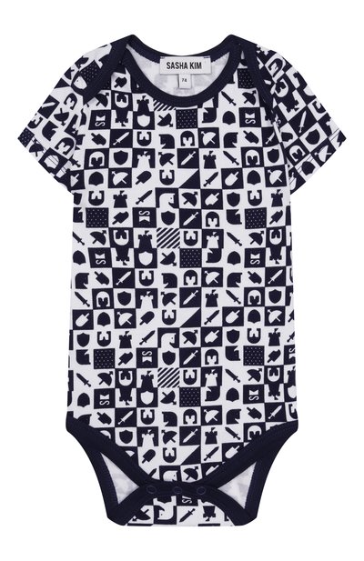 Боди сшили из мягкого трикотажа на основе шерсти мериноса первого пострига. Модель с плоскими швами и резинками на манжетах украсили контрастным изображением медвежонка спереди и логотипом на рукаве.
