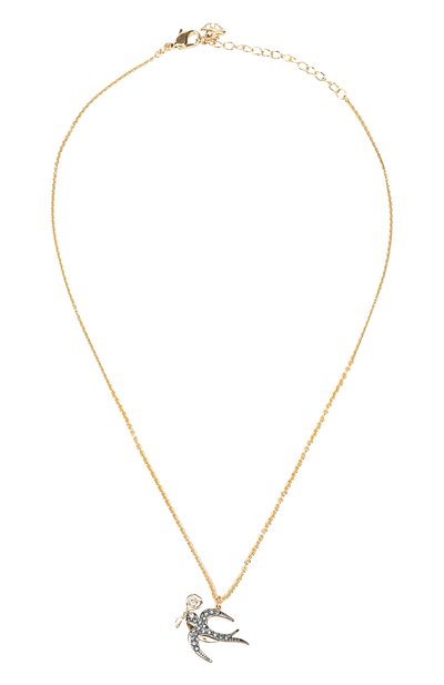 На создание миниатюрной подвески в виде ласточки дизайнеров бренда вдохновили символы карт Таро (изделие украсили паве из сверкающих кристаллов Swarovski, которые особенно эффектно выглядят в лучах света). Для изготовления модели мастера марки использовали легкий ювелирный сплав с золотистым покрытием.