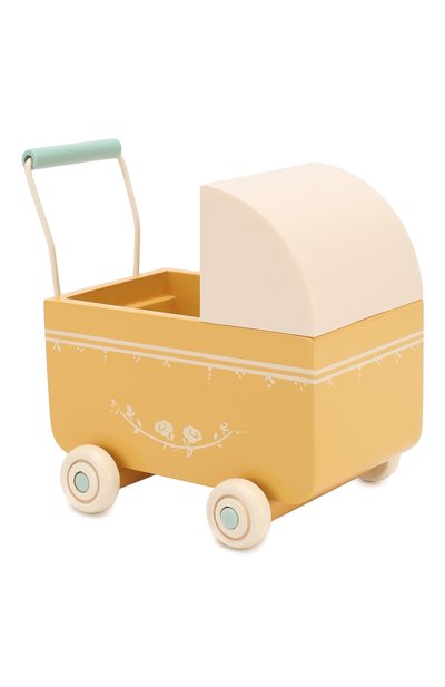 Коляска, выполненная в ретро-стиле, идеально подойдет для небольших игрушек марки. Реалистичная модель изготовлена из комбинации прочного дерева и легкого металла. Изделие желтого цвета, с белым куполом окрашено матовой гипоаллергенной эмалью, безопасной для детей. Цветочный рисунок сбоку выполнен вручную.
