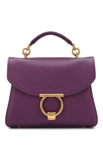 Аксессуары марки, основанной Сальваторе Феррагамо, легко узнать по знаковой пряжке Gancini, придуманной в 1960-х. Не исключение и небольшая сумка Margot из осенне-зимней коллекции: здесь характерная деталь – с золотистым покрытием. Модель насыщенного фиолетового оттенка выполнили из матовой зерненой кожи, устойчивой к царапинам. Внутрь поместятся смартфон, кошелек и ключи.