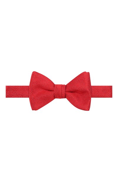 Красный галстук-бабочка выполнен из прочного, приятного на ощупь шелкового жаккарда с белым крапчатым узором. Изделие Pre-Tied дополнено эластичной лентой с металлическими крючком и петлей. Такой яркий аксессуар поможет разнообразить образ, соответствующий дресс-коду black tie.