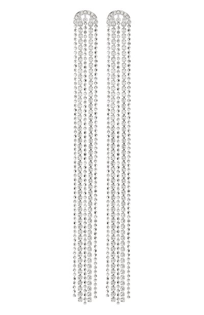 Серьги с застежками-пусетами дополнены длинными подвесками-кисточками из пяти цепочек. Три из них составлены из миниатюрных шариков с родиевым покрытием, две – из сверкающих прозрачных кристаллов. Такое украшение не любит прятаться, поэтому советуем уложить волосы в высокую прическу или зачесать их назад, открыв уши.