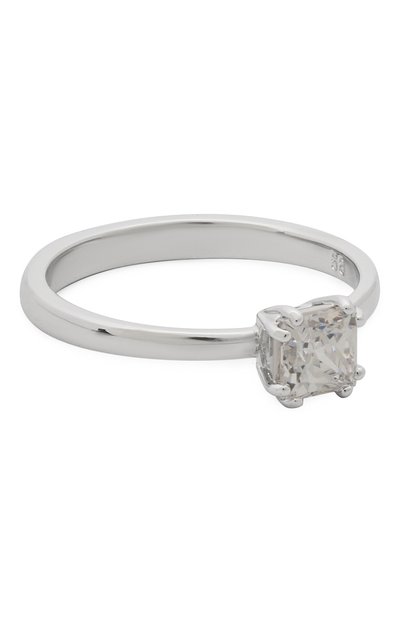 Серебристое кольцо-солитер выполнили из металла с родиевым покрытием. Благодаря ему минималистичный аксессуар не только не темнеет со временем, но и слегка блестит. С этим мерцанием срифмовали единственный элемент декора — крупный граненый кристалл в крапановой закрепке.