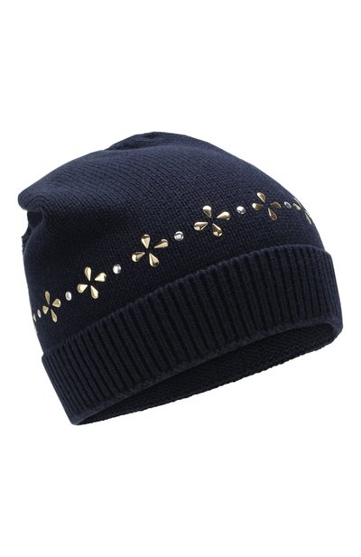 В шапке с пушистым помпоном будет комфортно в течение дня. Все дело в материале: хлопковая пряжа с добавлением мягких шерстяных волокон отвечает за оптимальную температуру, а широкий отворот, связанный резинкой, не натирает и не пережимает сосуды. Спокойный темно-синий цвет стал удачным фоном для круглых и каплевидных заклепок.