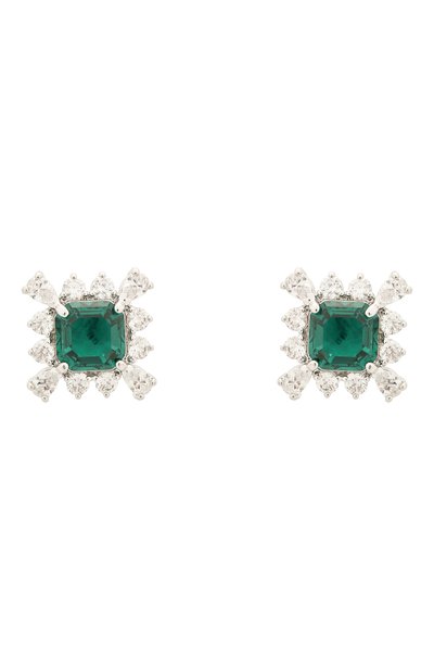 Мастера марки изготовили эти серьги из полированного металла с родиевым покрытием. Изумрудно-зеленый оттенок крупного центрального кристалла подчеркнули миниатюрными прозрачными. Чтобы каждый из элементов эффектно преломлял свет, их закрепили едва заметными крапанами.