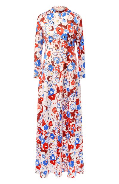 Макси-платью из осенне-зимней коллекции не нужны аксессуары. Модель с невысоким воротником-стойкой выглядит самодостаточно благодаря яркому растительному принту, в котором соединили красный, голубой и желтый оттенки. Найти гармонию в узоре получилось, разместив цветы разной формы на кремовом фоне. Приталенное изделие сшили из плотной струящейся ткани.