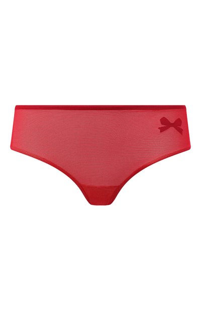 Красные трусы выполнили из полупрозрачного сетчатого тюля с добавлением эластичных нитей. Белье из такого материала комфортно облегает, а благодаря плоским швам не натирает кожу и незаметно под тонкой одеждой. Модель декорировали аппликацией в виде знакового банта.