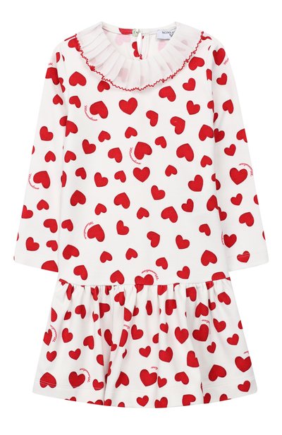 Белое платье с паттерном из алых сердец изготовлено из эластичного вискозного трикотажа, поэтому не потеряет форму и цвет с о временем. Дизайнеры марки подчеркнули круглый вырез широкой плиссированной оборкой из полупрозрачного муслина. С ней гармонирует расклешенный подол с крупными мягкими складками.