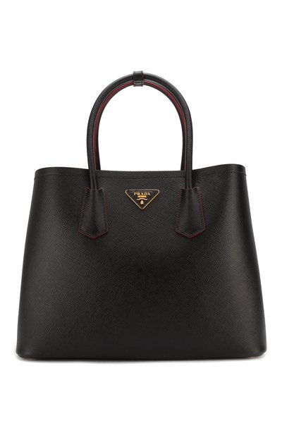 У черной сумки Double из осенне-зимней коллекции жесткое дно, поэтому найти в ней ключи не составит труда. А боковые кнопки помогают регулировать объем аксессуара. Для создания модели с алой подкладкой Миучча Прада выбрала прочную сафьяновую кожу. Внутрь поместятся бумаги формата А4, складной зонт, кошелек и телефон. В комплекте – съемный плечевой ремень.