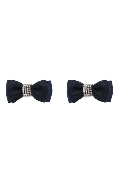 В комплект вошли две синие заколки в виде бантов. Декор сформировали из двух видов ткани: ленты гросгрейн и материала, похожего на атлас. Узлы подчеркнули прозрачными стразами, которые эффект переливаются. Зажимы не сползают, но при этом не спутывают и не повреждают волосы.