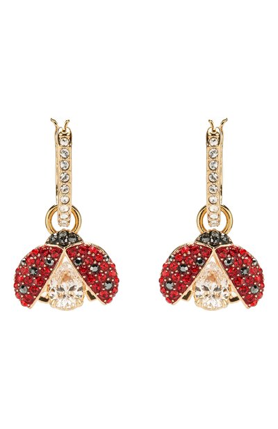 Серьги с подвесками считаются классикой, но исполнении дизайнеров бренда они получились одновременно универсальными и яркими. Модель из позолоченного ювелирного сплава позволяет экспериментировать с образом: носите их в лаконичном варианте или добавьте игривого настроения, дополнив элементом в виде божьей коровки. В качестве декора на модели выступают прозрачный кристалл и стразы черного, рубинового оттенков.