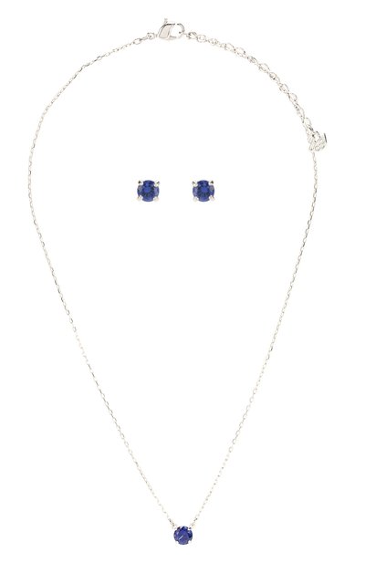 Для создания тонкого колье и небольших пусетов использовали легкий прочный сплав с серебристым родиевым покрытием, которое долго не тускнеет. Изделия декорировали крупными синими кристаллами, эффектно преломляющими лучи света. Длину цепочки удобно регулировать при помощи миниатюрного карабина.