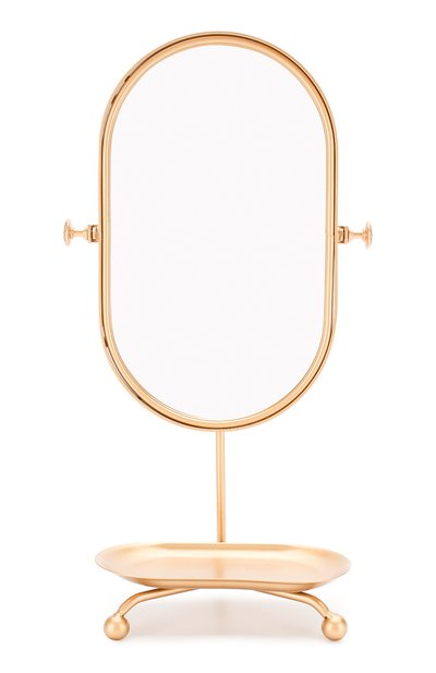 Игрушка выглядит как уменьшенная копия настольного зеркала. Мастера дополнили овальную модель рамой из легкого прочного металла с золотистым напылением, а основание на трех ножках — неглубокой чашей для небольших вещей. Каркас украшают две декоративные ручки с тиснением.
