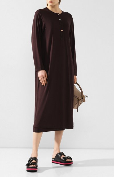 В весенне-летней коллекции отчетливо прослеживаются черты минимализма: костюм цвета горького шоколада не стал исключением. Комплект сестры Рубан составили из туники свободного кроя и миди-юбки. Изделия объединяет как плотная эластичная ткань, так и пуговичный ряд сбоку. Его можно расстегнуть, поставив акцент на ноге.