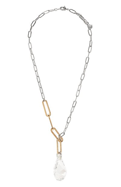 Колье в виде цепочки с крупными звеньями разного размера, формы и цвета – смелое заявление для поклонниц минимализма. Для создания аксессуара мастера марки использовали прочный гипоаллергенный сплав с золотистым и серебристым покрытием. Модель дополнили массивной каплевидной подвеской из прозрачного ограненного кристалла.
