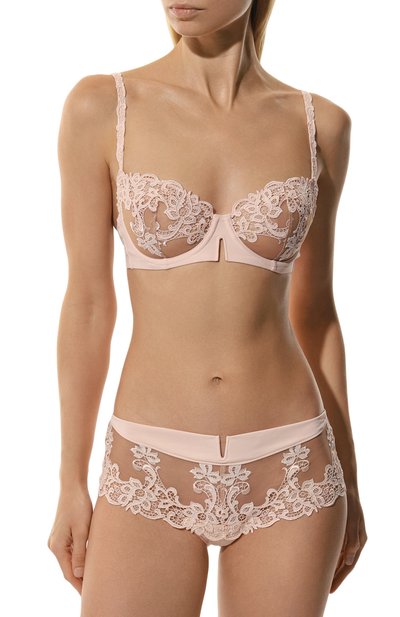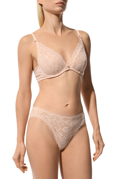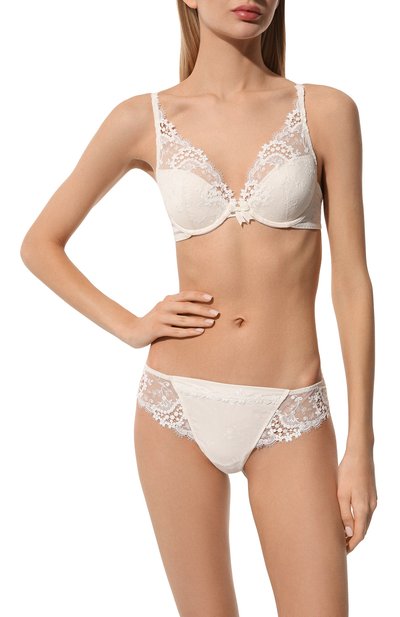 Кремовые слипы сшили из тонкого шелковистого материала с добавлением стрейчевых волокон. Трусы из него плотно облегают тело, повторяя каждое движение, и не раздражают кожу, а благодаря плоским гладким краям не сдавливают и не натирают. Спереди модель с узким поясом декорировали миниатюрным атласным бантом и полупрозрачными кружевными вставками с цветочным узором, вдохновленным Елисейскими полями.
