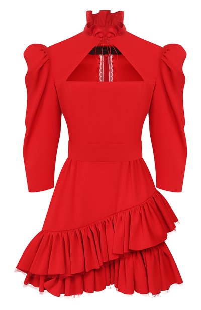 Короткое огненно-красное платье выглядит самодостаточно и не нуждается в дополнительных акцентах. И дело не только в ярком цвете, но и в крое. Ульяна Сергеенко задала правильное настроение при помощи рукавов буфф, воротника-стойки в викторианском стиле, фигурного выреза и пышных оборок на расклешенном подоле. Для создания приталенной модели из весенне-летней коллекции использова ли тонкий матовый креп.