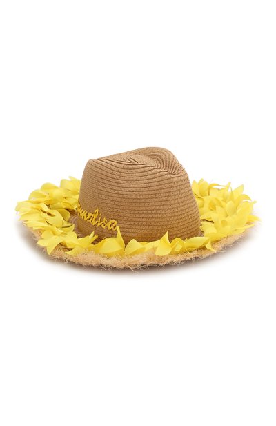Для создания шляпы мастера марки использовали прочную неокрашенную соломку. Материал не боится влаги и хорошо держит форму, поэтому головной убор прослужит долго. Тулью украсили вышивкой в виде логотипа бренда, а широкие поля с необработанными краями — желтыми лепестками цветов из органзы.