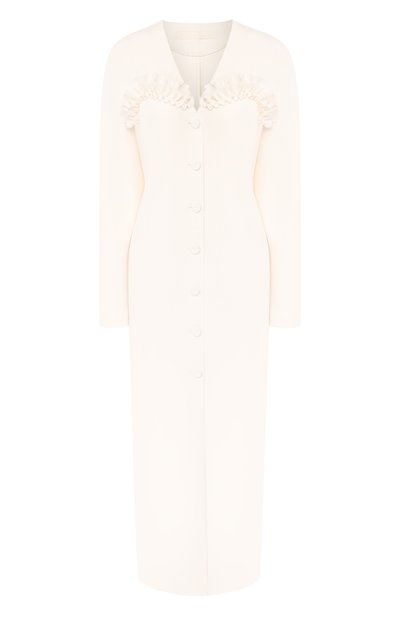 На примере модели из весенне-летней коллекции Ульяна Сергеенко доказала, что белое платье с минимумом декора может выглядеть нарядно. Длинное изделие из мягкого шерстяного крепа скроили так, что оно формирует силуэт «песочные часы», а оборка подчеркивает декольте. Одежда такого цвета открыта для экспериментов с деталями. Наши стилисты рекомендуют носить ее с красными туфлями и клатчем в тон.