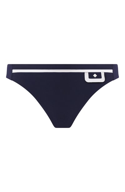 Лаконичный вид темно-синих плавок нарушили белой полосой у пояса с плоской вставкой в виде миниатюрного кошелька. Деталь закрепили только сверху. С основной частью изделия ее объединяет материал. Для пошива модели мастера марки использовали плотную матовую ткань, которая хорошо тянется.