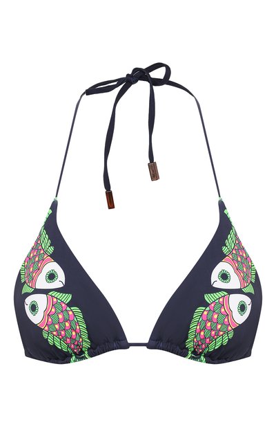 Бра с треугольными чашечками сшили из мягкого эластичного полиамида, который хорошо держит форму и быстро сохнет. На темно-синем фоне — крупный зеленый мотив в виде рыб. Посадка регулируется завязками на спине и бретелями на шее.