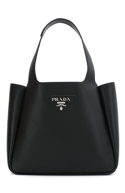 Черная сумка громко заявляет о своей принадлежности бренду при помощи треугольного патча с логотипом. Для изготовления модели с двумя удлиненными широкими ручками Миучча Прада выбрала мягкую зернистую кожу с деликатным матовым блеском. В аксессуар поместятся смартфон, кошелек и ключи.