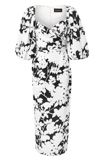 Праздничный образ во многом зависит от фактуры, и при создании платья с монохромным цветочным мотивом дизайнер взяла это правило за основу. Оставив подол лаконичным, акцент перенесли на лиф: сложносочиненный драпированный лиф с декольте в форме сердца дополняют объемные рукава-фонарики. Модель из гладкого тонкого сатина вошла в весенне-летнюю коллекцию.
