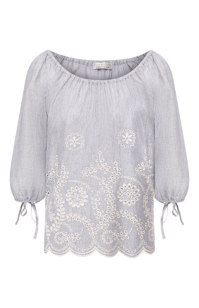 Голубая туника свободного силуэта, с глубоким вырезом и укороченными рукавами изготовлена из тонкого дышащего хлопка с ажурной вышивкой ришелье. Легкая модель из весенне-летней коллекции марки, основанной Евой и Эберхардом Битцер, будет незаменима в жаркие дни.