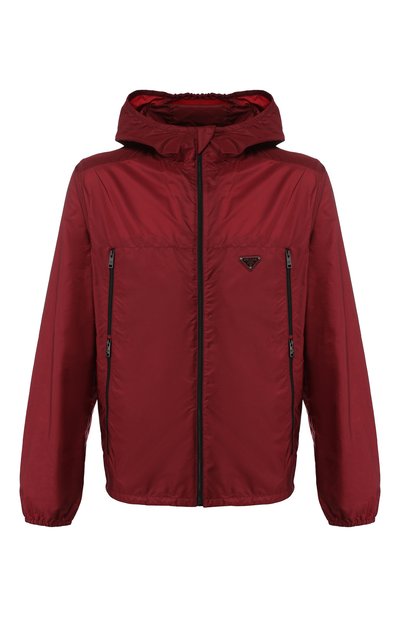 Миучча Прада включила в коллекцию сезона весна-лето бордовую куртку из знакового для бренда материала — нейлона. Легкую, но прочную ткань покрыли водоотталкивающим средством. Модель защитит от дождя не только вещи, но и рюкзак за счет заднего клапана, застегивающегося молни ей. Для большего комфорта в изделии предусмотрели капюшон с высокой стойкой и эластичным краем. В манжеты также продели резинки.