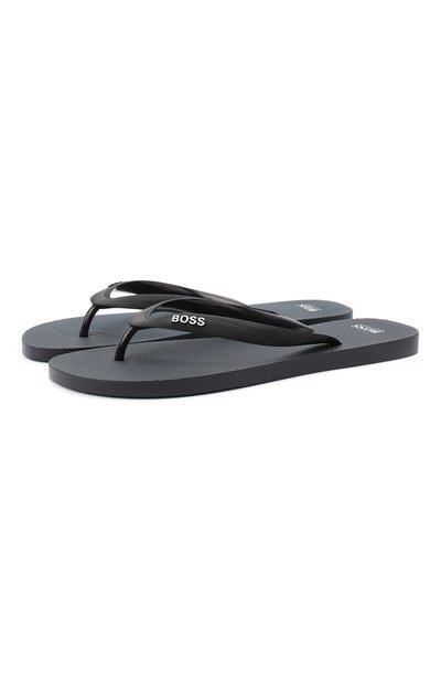 Темно-синие резиновые шлепанцы с ребристой стелькой и гибкой подошвой не скользят на влажных поверхностях и не нагреваются на солнце. На узких Y-образных ремешках, как у вьетнамок, — рельефное тиснение и небольшие белые логотипы марки. Модель вошла в осенне-зимнюю коллекцию марки, основанной Хуго Фердинандом Боссом.