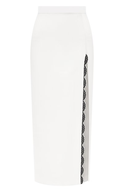 Главную роль в дизайне этой белой юбки Ульяна Сергеенко отдала провокационному разрезу слева, который эффектно открывает ногу во время движения. Подчеркнуть его помогла монохромная кружевная лента с фестончатыми краями. Модель из легкого крепа вошла в весенне-летнюю коллекцию.