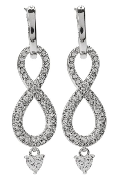 Серьги из легкого сплава с родиевым покрытием могут гордиться своим математически выверенным силуэтом. Аксессуар украсили подвеской в виде знака бесконечности с паве и сердцем из прозрачного кристалла. Детали можно отсоединить, превратив вечерний сет в модель на каждый день или создав асимметричный комплект.