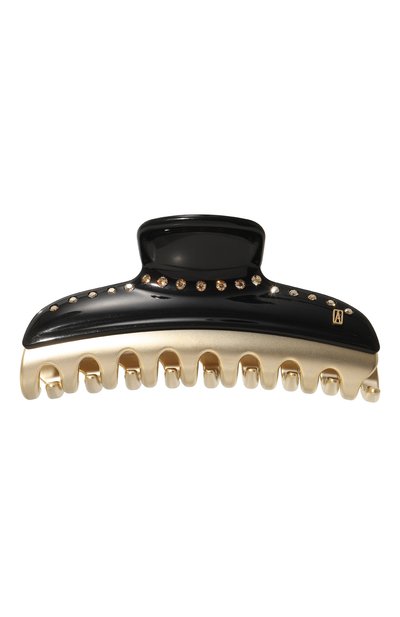 Для изготовления заколки-краб использовали глянцевый ацетат, полученный из цветов хлопка и древесной целлюлозы. Аксессуар с закругленными зубцами декорировали кантом из кристаллов Swarovski и миниатюрной эмблемой.