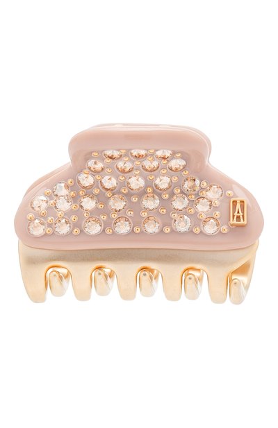 Несмотря на миниатюрный размер и неброский светло-розовый оттенок заколка-краб не останется незамеченной: аксессуар эффектно мерцает в волосах множеством прозрачных кристаллов Swarovski. Модель с золотистыми крупными зубцами выполнили из легкого, отполированного до глянцевого блеска ацетата, который стал более гибким и гладким благодаря выдерживанию деталей в бочках с древесиной и пемзой.