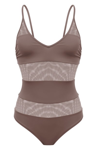 Для пошива слитного купальника на узких бретелях Наталья Якимчик по традиции выбрала плотный матовый материал и просвечивающуюся сетку, но на этот раз провокационность контраста фактур сгладила приглушенным кофейным оттенком. Он выгодно подсвечивает загар и задает расслабленное настроение.
