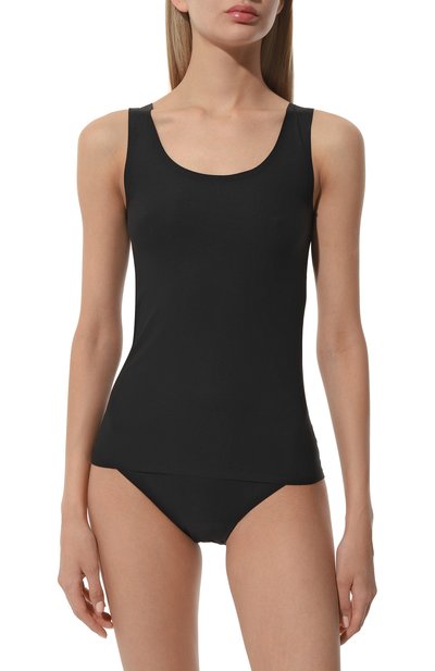 Бесшовную майку выполнили из нейлоновой микрофибры Soft Stretch. Однотонная модель с глубоким круглым вырезом подходит для размеров от XS до XL.