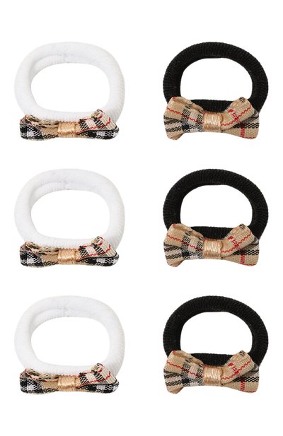 Резинка из прочного эластичного материала плотно удерживает прическу, не повреждая при этом структуру волос и не стягивая кожу головы. Модель декорировали бантом из фактурного текстиля с разноцветным клетчатым узором. В комплект вошли шесть аксессуаров двух цветов: черного и белого.