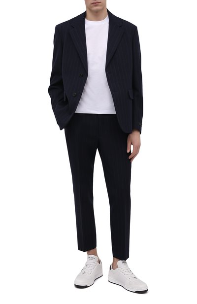 Миучча Прада дополнила слегка укороченные синие брюки с широкими боковыми вставками в тон. Для пошива модели дизайнер выбрала мягкий эластичный полиэстер. Изделие из такого материала почти не мнется, комфортно садится по фигуре и не сковывает движения.